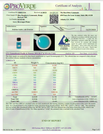 At The Best Dirty Lemonade, transparency and quality are key. Our Certificate of Analysis (COA) provides detailed lab results for each of our THC-infused lemonade products. We prioritize your safety by ensuring every batch is third-party tested for purity, potency, and compliance with state regulations. Browse our COAs to see the cannabinoid profiles, THC content, and absence of harmful contaminants, so you can sip with confidence. Know exactly what’s in your drink and enjoy The Best Dirty Lemonade guilt-free.